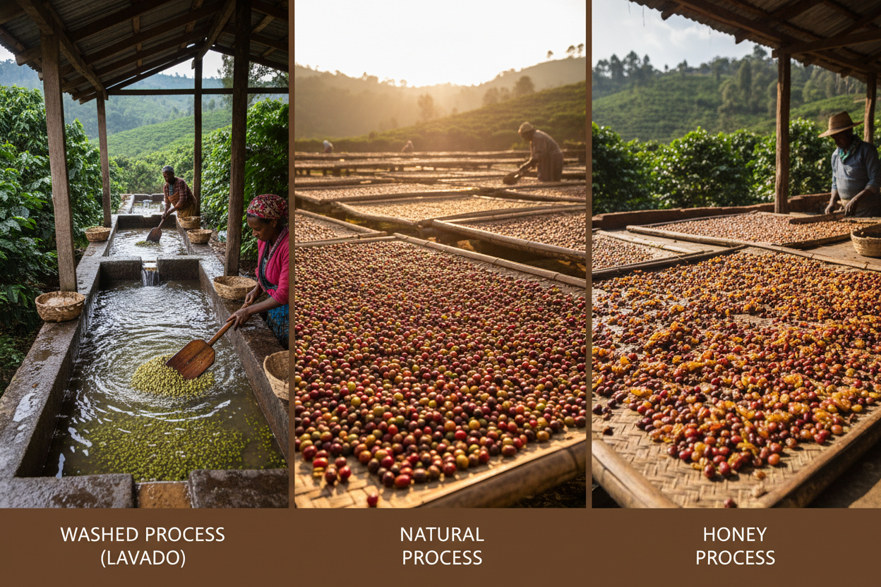 El perfil final de un café etíope está profundamente influenciado por su proceso de beneficio.NaturalEl café se seca con la pulpa de la cereza, generando perfiles intensos, dulces y muy frutales.LavadoProceso más limpio y delicado que resalta las notas florales, la acidez brillante y la claridad en taza.HoneyUn proceso intermedio que combina dulzor, textura y complejidad aromática.
